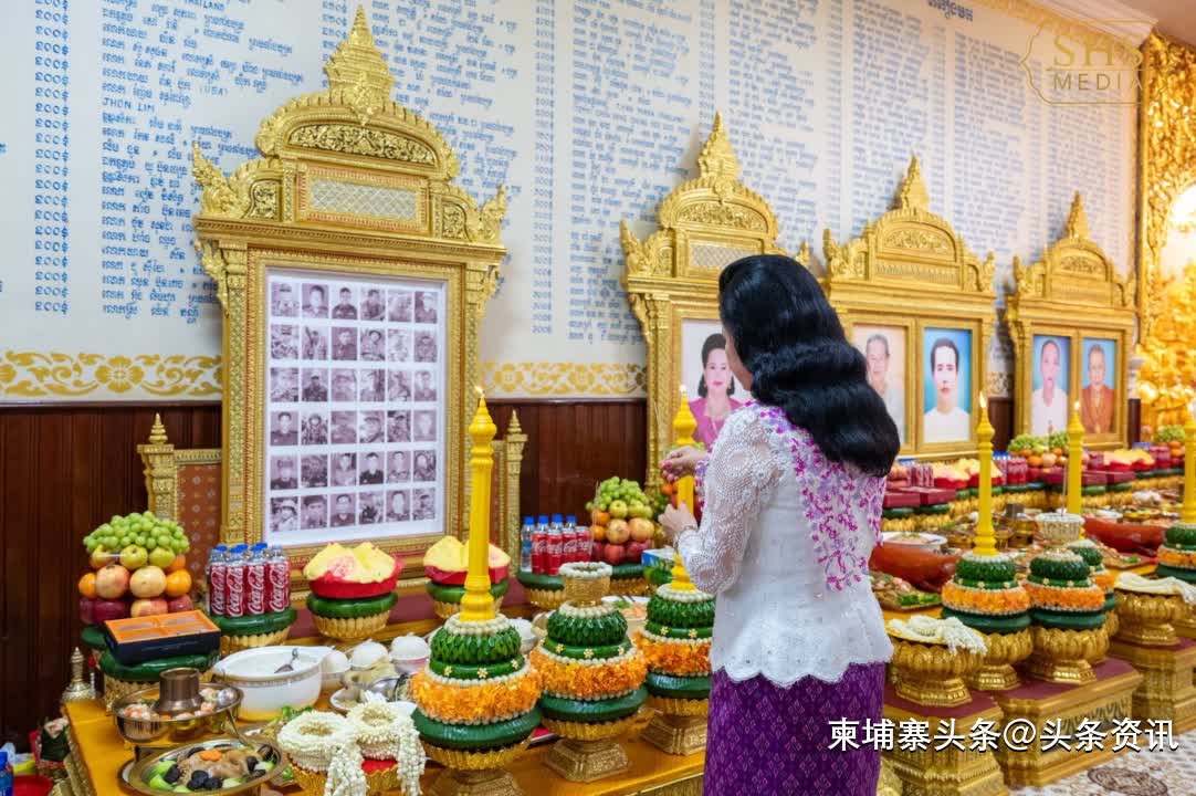 在寺庙中,洪森亲王夫妇及其家人向僧侣献上鲜花、蜡烛、香及其他供品,并一同为亡故的亲友诵经回向。