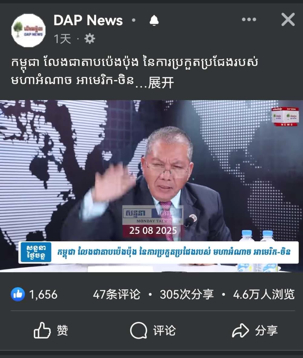在脸书、YouTube、tiktok拥有百万粉丝的帅速比8月25日在其招牌评论节目《周一秀》中说:中国和美国两个大国家出面劝告柬泰边境停火 ,意味着柬埔寨已经不是中国和美国在地缘政治竞争中的乒乓球桌了。他说,其实也不是美国和中国在柬埔寨搞什么地缘政治竞争,而是柬埔寨是个坚持一个中国立场的国家,也是跟中国结成“钻石”伙伴关系的国家。泰国是美国的传统盟友,购买了美国先进武器在柬泰800公里的边境地区,不断施压柬埔寨、侵占柬国边境领土。