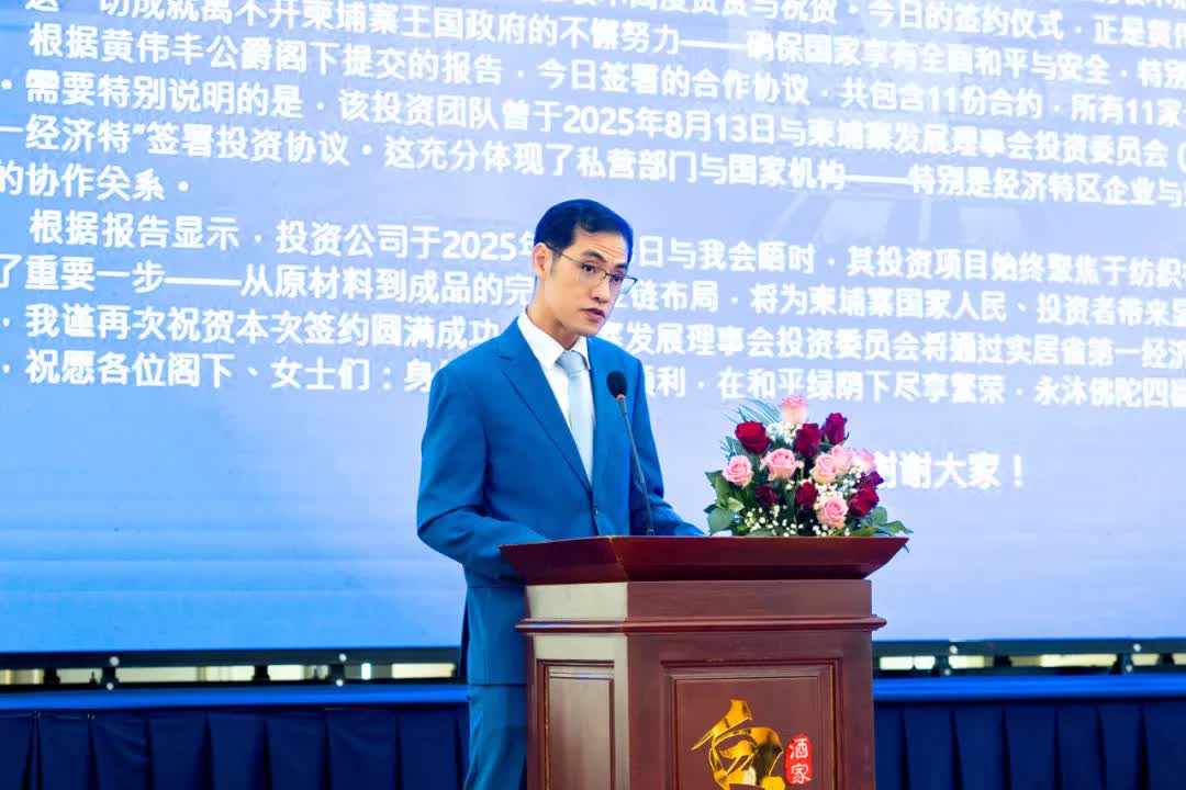 作为东盟成员国中的地理中心,柬埔寨拥有辐射 6.8 亿人口庞大市场的独特优势,加之稳定的发展环境与丰富的自然资源,已成为全球投资者眼中的 “兴业热土”。索贡兴阁下特别提到,实居省正加速崛起为柬埔寨除首都金边之外的第二大工业基地,政府正积极规划建造两座大型物流枢纽,致力于将其打造为东盟区域重要的物流中心。“今天各位签署的不仅是一份份合作合约,更是对未来共同繁荣的坚定承诺。” 最后,他衷心祝愿在场投资者与企业家事业蒸蒸日上,在柬埔寨这片土地上收获辉煌成就。