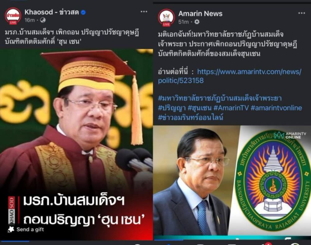 【柬埔寨头条综合报道】据柬媒消息称,8月22日晚,柬埔寨参议院主席洪森亲王通过其官方社交媒体平台发表声明,宣布已将过去由泰国高校颁发的全部学位证书弃置,并直言这些文凭“对我毫无价值”。