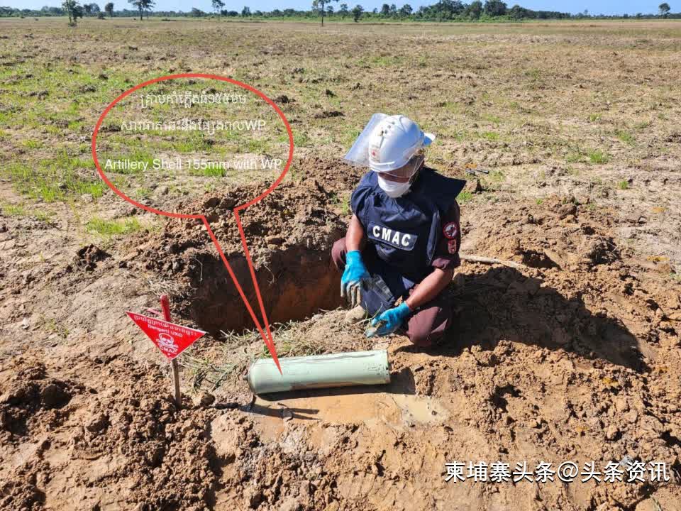 【柬埔寨头条综合报道】据柬媒消息,2025年8月14日晚,柬埔寨排雷行动中心(CMAC)主任兴洛达那透露,排雷专家近日在奥多棉芷省班迭安比县发现一枚泰军发射的烟雾弹。该弹药中含有易燃物质以及有毒的白磷(WP),对人体健康和环境安全构成严重威胁。