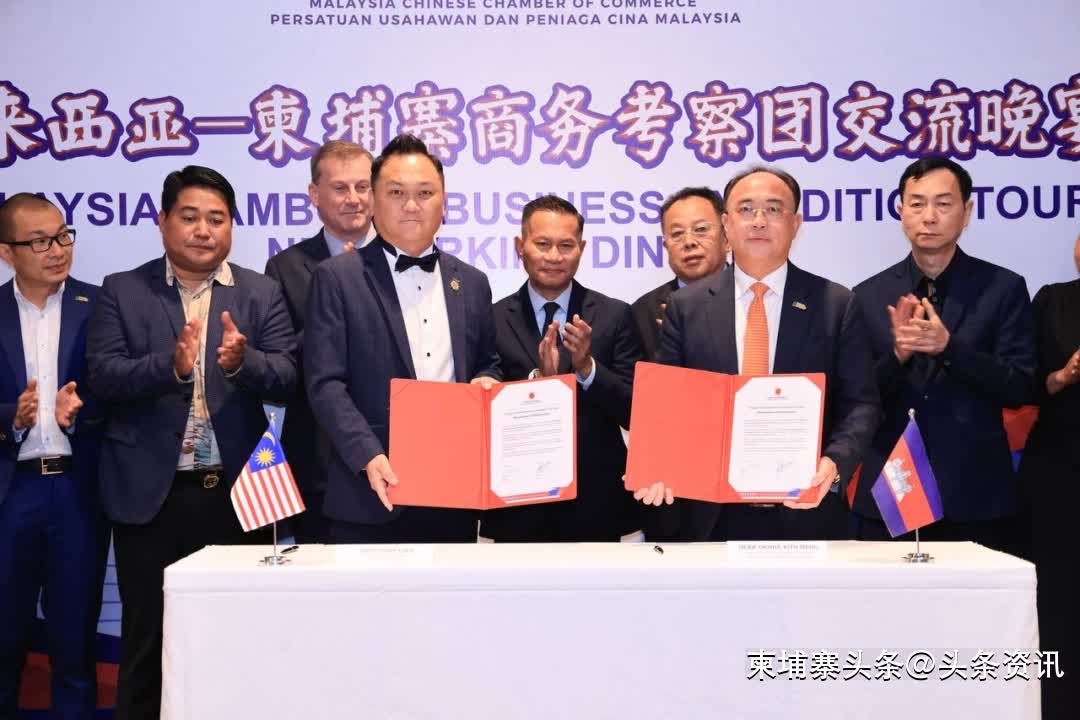 【柬埔寨头条综合报道】据柬媒消息,2025年8月12日晚,柬埔寨总商会会长、东盟商业咨询理事会主席陈丰明公爵与中国马来西亚总商会主席Tony Looi签署联合合作声明,为两国商会建立正式合作框架,旨在推动柬埔寨与马来西亚之间的贸易与投资。