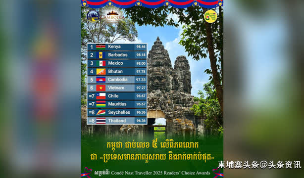 【柬埔寨头条综合报道】据本地媒体报道,在《Condé Nast Traveller(悦游)》2025年”读者之选”评选中,柬埔寨获评为全球第五大友好国家。