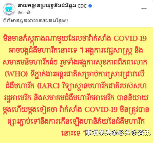 【柬埔寨头条综合报道】据柬媒10月4日报道,柬埔寨疾病预防控制中心(CDC)于当天下午发布声明,明确指出目前没有任何科学证据表明新冠疫苗会导致癌症。